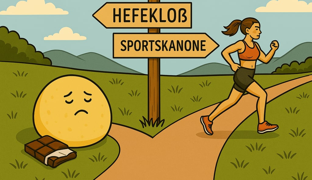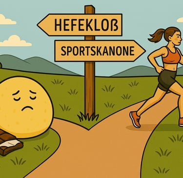 Vorab: Ja, das Bild ist überzeichnet und provokant – und genau so meine ich es auch: Mit einem Augenzwinkern. Wer meinen Blog oder meine Insta-Beiträge kennt, weiß, dass ich selbst schon oft den Weg des „Hefekloßes“ gewählt habe. Ich kenne Gewichtsschwankungen von 30 Kilo rauf und runter – und damit auch beide Seiten: Die der vermeintlich gemütlichen Schokosofa-Version und die der energiegeladenen „Sportskanone“.